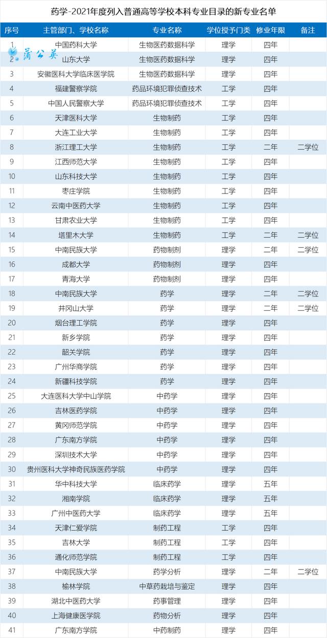 经小编辑梳理发现,2021年共有38所院校新增41个药学类本科专业,涉及13个专业。