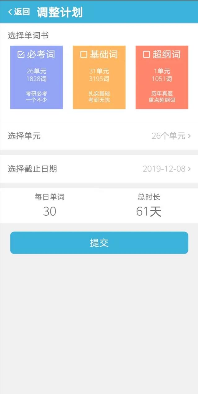 2.调整计划:用户可根据自身情况,对《【红宝书】考研英语词汇》必考词(26个单元)、基础词(30个单元)、超纲词(A-D)灵活制定学习计划。