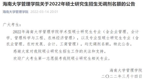 海南大学管理学院2022年硕士研究生招生无调剂名额公告