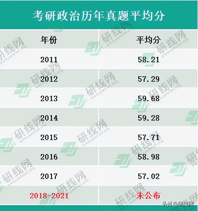 2018~2021年,教育部考试中心未公布考研政治平均分,从2011~2017年来看,考研政治平均分分值上下波动不大,基本保持在57~60分之间。