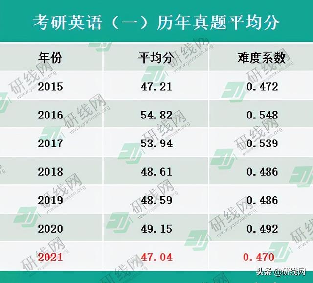 从2015~2021年历年平均分来看,考研英语(一)平均分最高为2016年54.82,最低分为2021年47.04,而难度系数和考研平均分呈现正相关性,难度系数最低为2016年0.548,最高为2021年0.470。
