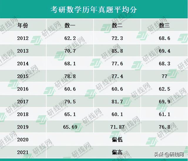 近两年考研数学并未公布平均分,2012~2019年,数一平均分最低为60.6,最高分为78.8。
