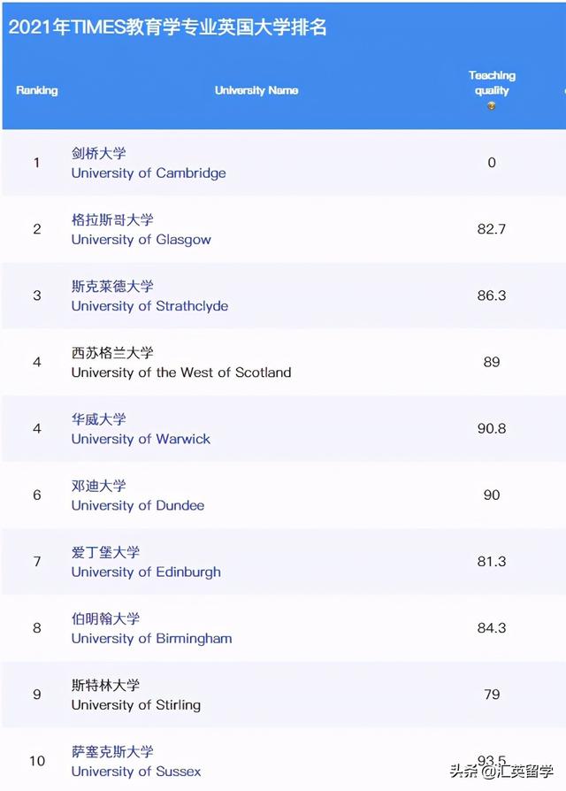 作为英国最知名的大学排名之一,TIMES英国大学排名具有相当的专业性和极高的权威性,一直以来都是英国留学选校的首要参考。以下是2021年TIMES英国大学教育学专业排名。