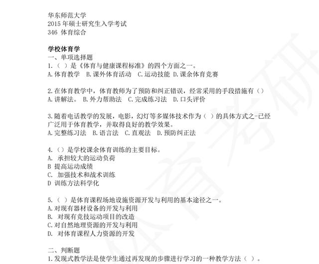 本期真题 华东师范大学 346-体育综合考研真题(2020-2015年) 真题部分截图如下,高清版本支持打印~~~ 领取详情可关注我们的微信公众号“唯体体育考研”,详见公众号推文!!! 有任何关于体育考研的问题欢迎大家给小编留言,小编会及时回复大家,不要着急哦!