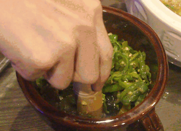 皮蛋和成丝的螺丝椒放在碗里,用“棒子”锤锤锤~皮蛋特有的口味跟螺丝椒结合起来。脆嫩的口感带点黏,NICE!