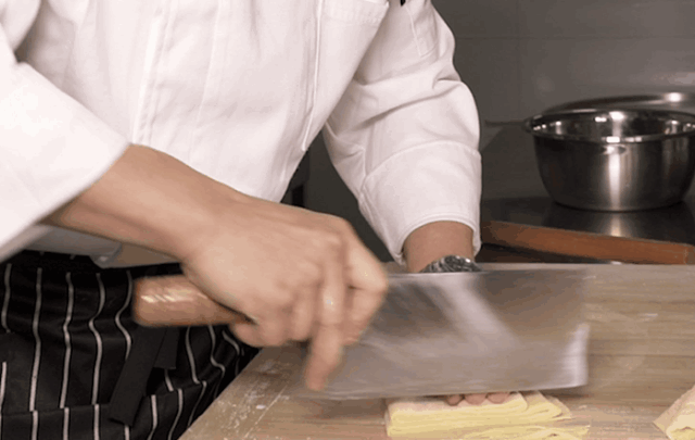而又一湘在传统工艺上推陈出新,选用京城最好的面粉,在和面压制的过程中,不加一滴水,全部用鸡蛋调制而成,再由经验丰富的大厨手起刀落,切成细细密密的面条状。