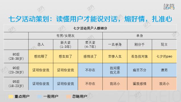 所以,做好用户定位是从产品定制到营销文案都需要的一个环节,根据七夕节日特点,我以80后用户为起点,按照感情状况和年龄阶段做了用户分层。