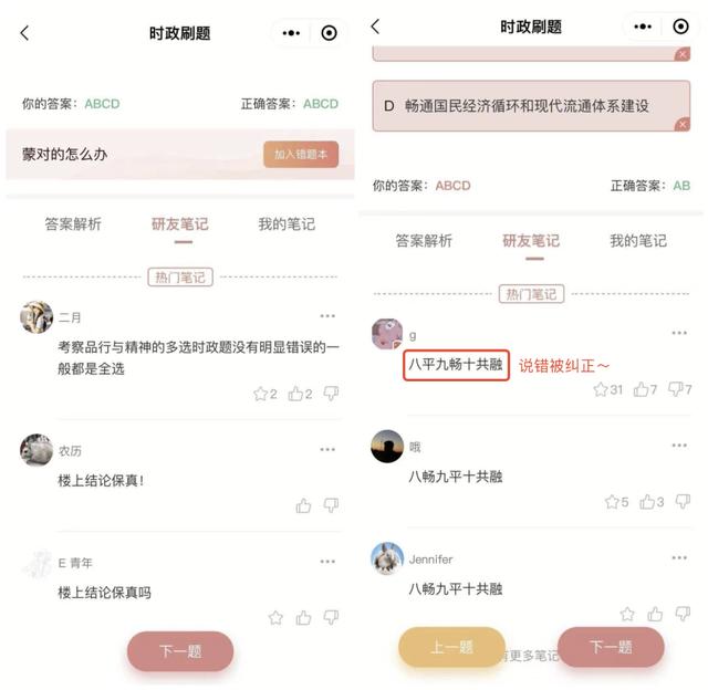今天小白在和团队讨论优化「时政刷题」的功能,发现大家在题目的“笔记区”分享了很多干货,甚至交流起来了~