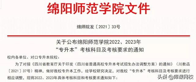 为了对接《四川省教育厅关于印发〈四川省普通高校专升本考试招生办法调整方案〉的通知》(川教函〔2021〕37号)精神,做好我校专升本工作,经学校研究决定,对我校“专升本”考核科目及考核要求进行相应调整,现将2022、2023年具体考核科目和考核要求通知如下:
