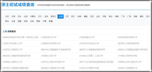 中国研究生招生信息网也提供成绩查询,考生届时可登陆「中国研究生招生信息网」,选择相应省市,找到所报考单位,点击进入查询。