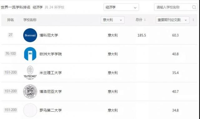 在最新公布的软科一流学科排行榜中,意大利“经济学”学科排名靠前的主要有以下学校:博科尼商业大学世界排名第27位、欧洲大学学院世界排名第76-100位、米兰理工大学世界排名第151-200位、博洛尼亚大学世界排名第151-200位、罗马第二大学世界排名第151-200位。