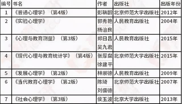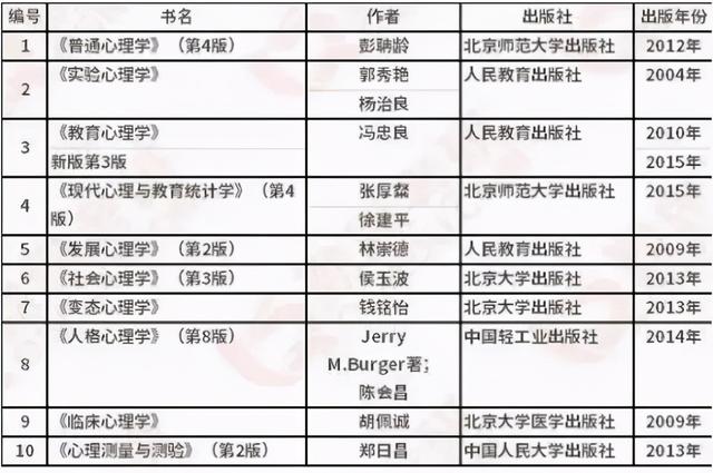 《心理学导论》梁宁建,上海教育出版社(2006);《儿童发展心理学》桑标,高等教育出版社(2009);《认知教学心理学》吴庆麟,上海科技出版社(2000);《教育心理学—献给教师的书》吴庆麟,华东师范大学出版社(2012)。
