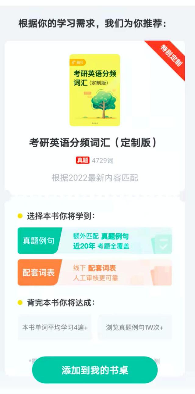 据我了解,扇贝是完全按照大纲分成2类十几种考研单词书,一类是和线下单词书配套的词表,基本涵盖了市面上主流的单词书,常见的红宝书之类的都有,可以点击查看更多单词书,扇贝会根据你的选择生成定制版考研词汇,完全契合线下书本,可以结合在用的实体书利用碎片时间。