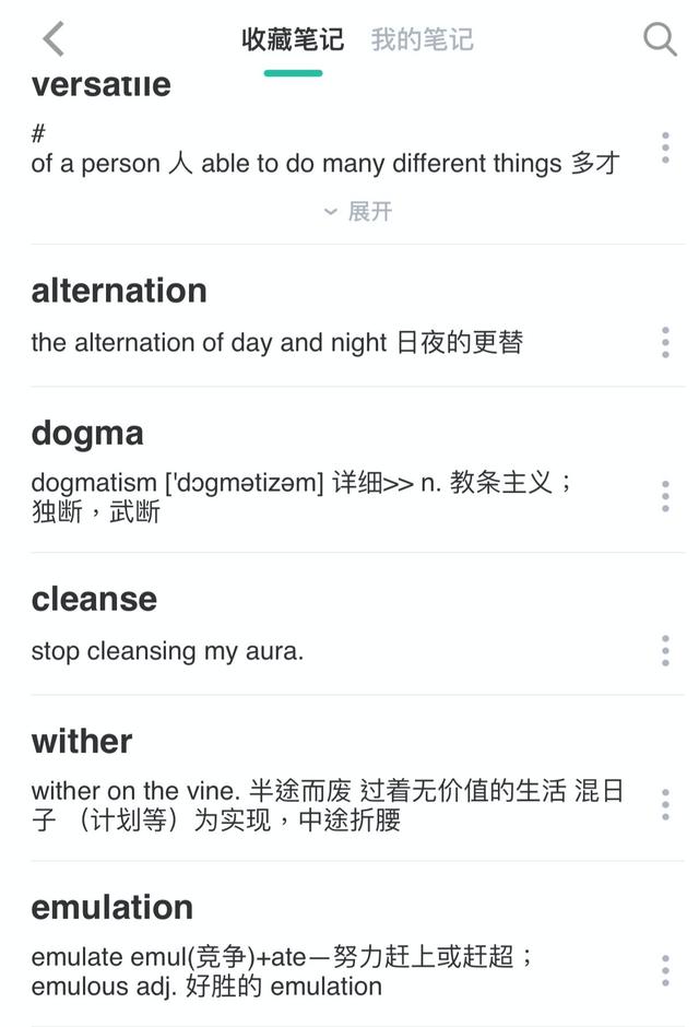 释义页面还有能看到其他学霸的生词笔记,遇到自己觉得不错的知识点,可以点击右侧的星星收藏,在【我的-单词笔记-左侧收藏笔记中查看到】又是向学霸学习的一天!