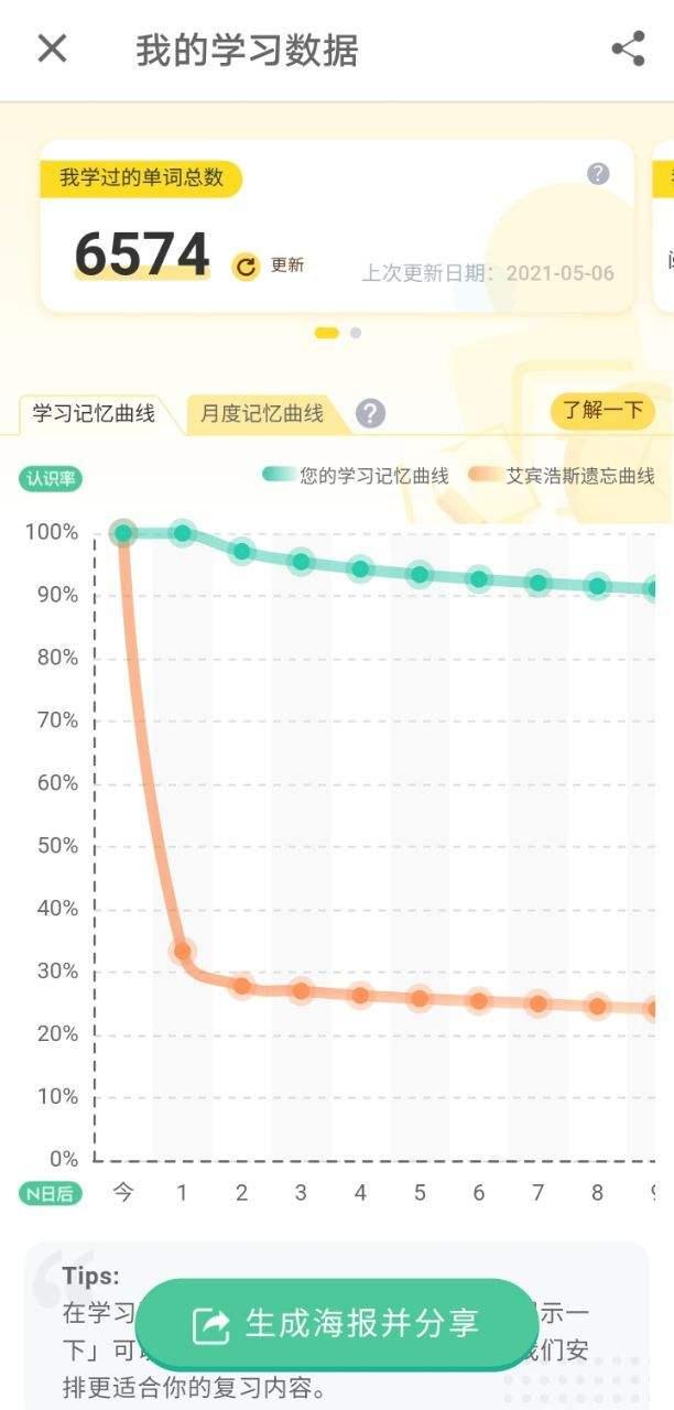 不知道有多少同学知道扇贝的记忆曲线规律,扇贝其实是基于艾宾浩斯遗忘曲线上做了算法升级,简单来说就是每个人的记忆程度是不一样的,对于同一个单词有的人可能就是要记十几遍但是有的人可能一遍就能记住了,复习出词中会对于认识的单词会减少出现的次数,对于不熟悉的单词对进行重点复习,减小复习压力。在【我的-学习数据】可以看到专属于自己的学习记忆曲线,单词的掌握程度一目了然,每日每周还有有学习报告,帮助我们对自己的记忆情况熟悉。