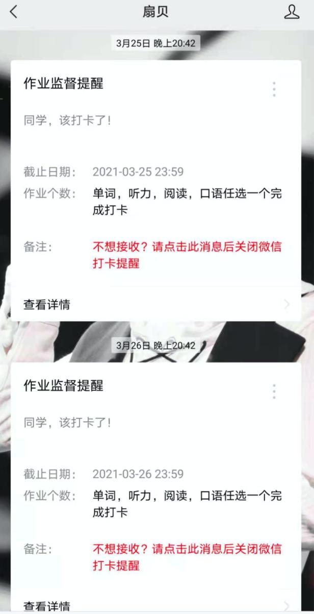 扇贝可以设置提醒时间,到时间就会及时提醒你背单词。本懒癌患者每日都被扇贝催着背单词。考研是一个长期的过程,容易有焦虑的情绪,扇贝的同桌功能,可以找个同桌互相鼓励,背单词更容易坚持下去。我已经和我的同桌一起打卡了300多天了,学霸同桌每天都雷打不动地坚持打卡,自己因为懒惰不想学习的时候,就会想到会导致同桌活动的失败,自己就在不知不觉中开始背单词了。