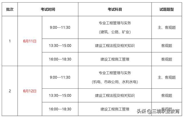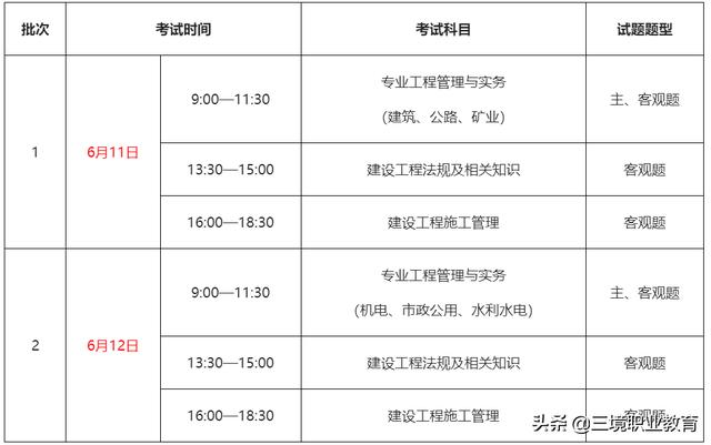 2022年二级建造师考试考试于6月11、12日举行,按《专业工程管理与实务》科目所选专业分2天2个批次实施,各科目考试时长缩短了半个小时/科,专业实务调整至上午考。如下图: