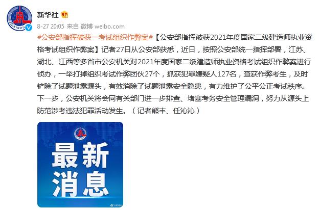 【公安部指挥破获2021年度国家二级建造师执业资格考试组织作弊案】记者27日从公安部获悉,近日,按照公安部统一指挥部署,江苏、湖北、江西等多省市公安机关对2021年度国家二级建造师执业资格考试组织作弊案进行侦办,一举打掉组织考试作弊团伙27个,抓获犯罪嫌疑人127名,查获作弊考生,及时铲除了试题泄露源头,有效消除了试题泄露安全隐患,有力维护了公平公正考试秩序。下一步,公安机关将会同有关部门进一步排查、堵塞考务安全管理漏洞,努力从源头上防范涉考违法犯罪活动发生。(记者熊丰、任沁沁)
