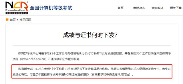 已知,教育部考试中心将在考后45个工作日内将合格证书下发给省级承办机构,然后由各省级承办机构逐级转发给考生。当然也可以在成绩公布时申请证书直邮。