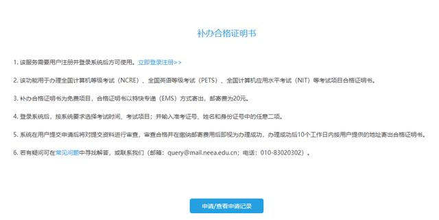 注意:补办合格证明书为免费项目,合格证明书以特快专递(EMS)方式寄出,邮寄费为20元