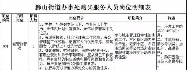 狮山街道招聘岗位:城管协管员3名招聘对象:具有中华人民共和国国籍;遵守中华人民共和国宪法和法律;具有良好的品行和职业道德,无违法犯罪记录;具备适应岗位要求所需的专业和技能条件;具有适应岗位要求的身体条件。尚未解除纪律处分或者正在接受纪律审查的人员,以及刑事处罚期限未满或者涉嫌违法犯罪正在接受调查的人员,不得应聘。岗位的具体资格条件及数量: