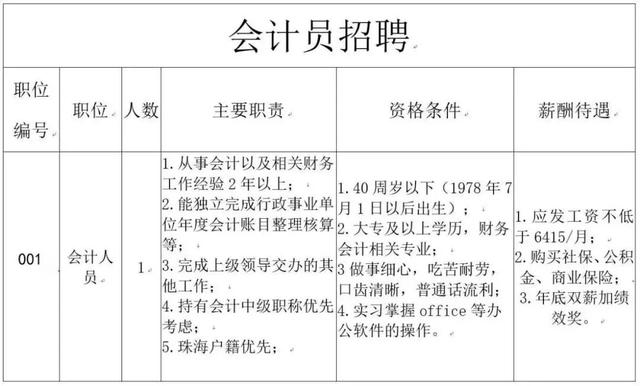 香洲区某政府单位招聘岗位:会计人员1名招聘对象:具有中华人民共和国国籍;遵守中华人民共和国宪法和法律;具有良好的品行和职业道德,无违法犯罪记录;具备适应岗位要求所需的专业和技能条件;具有适应岗位要求的身体条件。尚未解除纪律处分或者正在接受纪律审查的人员,以及刑事处罚期限未满或者涉嫌违法犯罪正在接受调查的人员,不得应聘。岗位的具体资格条件及数量: