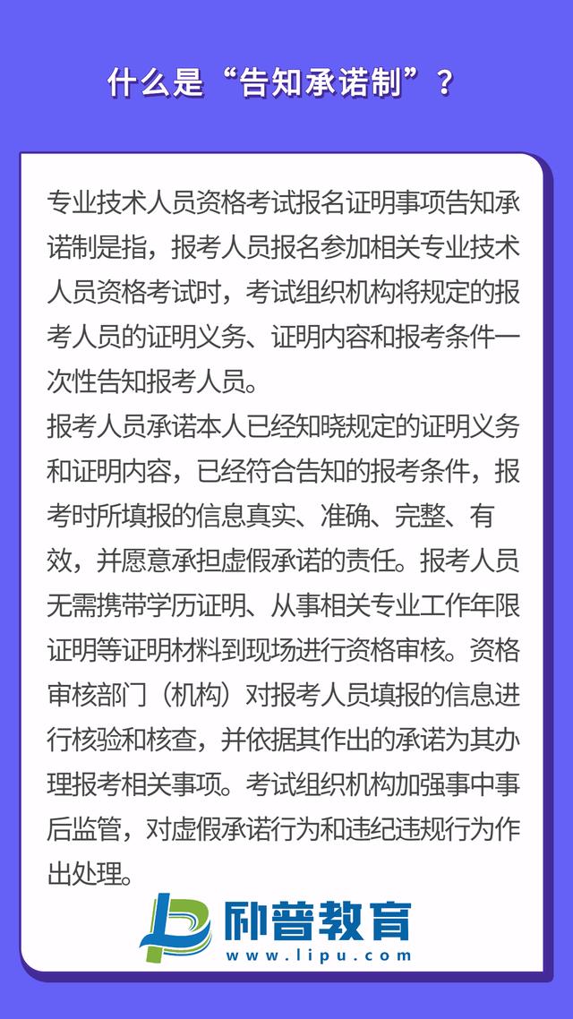 其实,“告知承诺制”就是指考生要对报名条件作出承诺。在报名初始环节不需要接受考前现场资格审查,报名成功后直接参加考试。考生对自己网上报名时所填写信息的真实性,完整性负责。