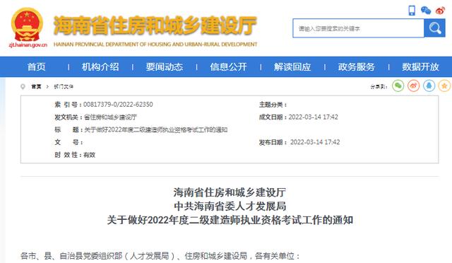 海南住建厅发布《关于做好2022年度二级建造师执业资格考试工作的通知》,2022年海南二级建造师报名时间3月15日0时至3月31日24时,详情如下: