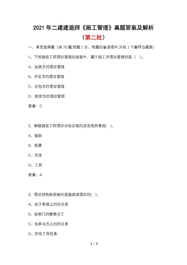 2021年第二批次二建《施工管理》考试时间为5月29日上午,考试省份包括江西、陕西、江苏、宁夏、浙江、甘肃、新疆、重庆、安徽、湖北、湖南、山东、辽宁、广西、青海、福建、河北、上海、山西等,以下是小编整理的2021年5月29日二建《施工管理》真题及答案解析完整版,供大家及时估分、对答案。