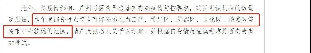 原文称:“受疫情影响,广州考区为严格落实有关疫情防控要求,确保考试机位的数量及质量,本年度部分考点将有可能安排在白云区、番禺区、花都区、从化区、增城区等离市中心较远的地区。”