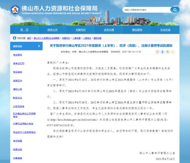 昨天同一时间,广东省佛山市人社局也发布通知:原定于2021年6月19日举行的佛山考区2021年高级经济师考试暂停举行。