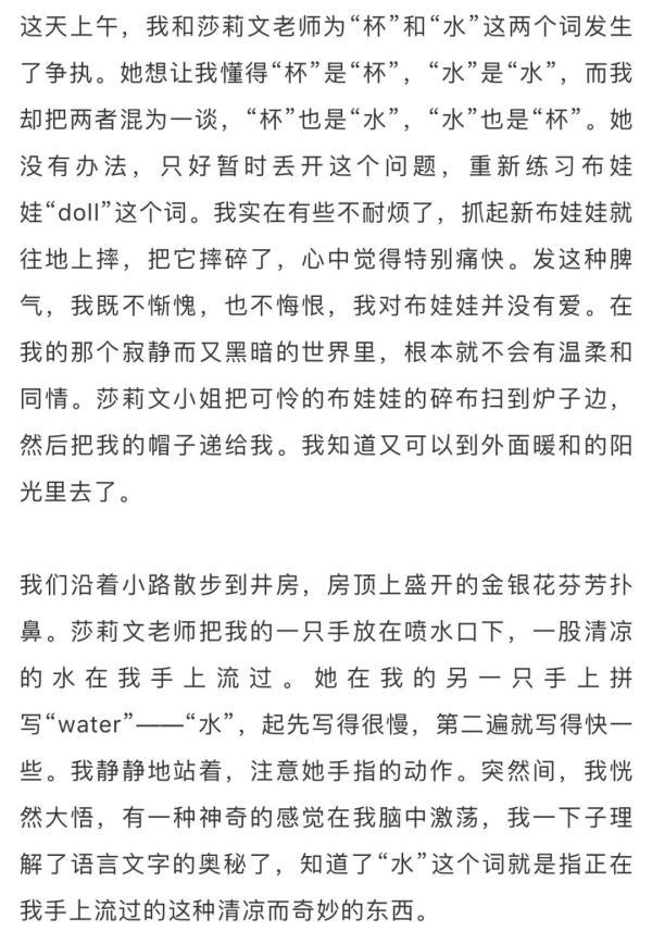 井房的经历使我求知的欲望油然而生。啊!原来宇宙万物都各有名称,每个名称都能启发我新的思想。我开始以好奇的眼光看待每一样东西。回到屋里,碰到的东西似乎都有了生命。我想起了那个被我摔碎的布娃娃,摸索着来到炉子跟前,捡起碎片,想把它们拼凑起来,但怎么也拼不好。想起刚才的所作所为,我悔恨莫及,两眼浸满了泪水,这是生平第一次。