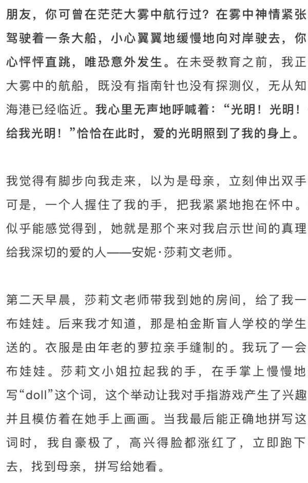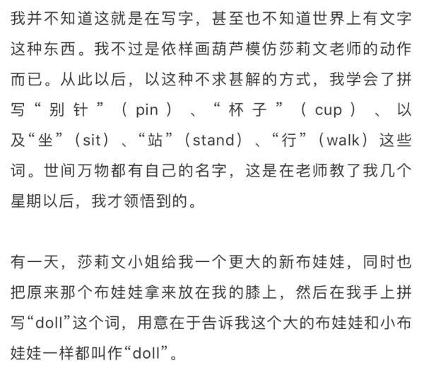 那一天,我学会了不少词,譬如“父亲”(father)、“母亲”(mother)、“妹妹”(sister)、“老师”(teacher)等。这些词使整个世界在我面前变得花团锦簇,美不胜收。记得那个美好的夜晚,我独自躺在床上,心中充满了喜悦,企盼着新的一天快些来到。啊!世界上还有比我更幸福的孩子吗?