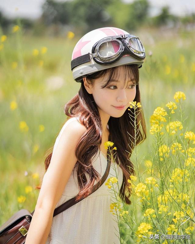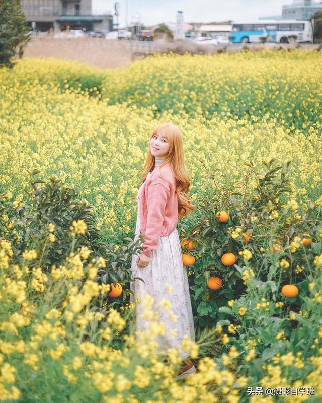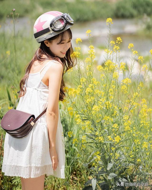 人的姿势,并没有什么太大问题,但是整片花海,没有被利用好。照片上方能够看到车和房子,让整张照片,看起来非常乱。而人的姿势很好,回头看镜头。在花海中,摄影师还可以像下图这样,引导人蹲下来,因为花海,会遮住人的腿,所以这种蹲姿,并不会不雅。同时摄影师使用,长焦镜头的长焦端,来缩小拍摄范围,避开背景上方杂乱的景物,让照片背景中全是花,就体现出花海了。
