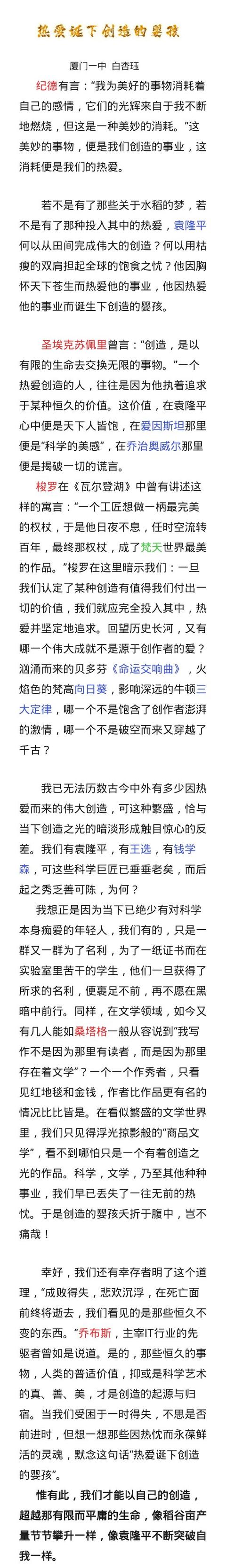 这篇作文的题目叫做《热爱诞下创造的婴孩》,这里暂时将标题改为《袁隆平的禾下乘凉梦》,作者是厦门一中的白杏珏,现在已是一位文字工作者,可能很多人在看到这个题目时,都会感到这个题目好像有点语病,诞下和创造不重复吗?