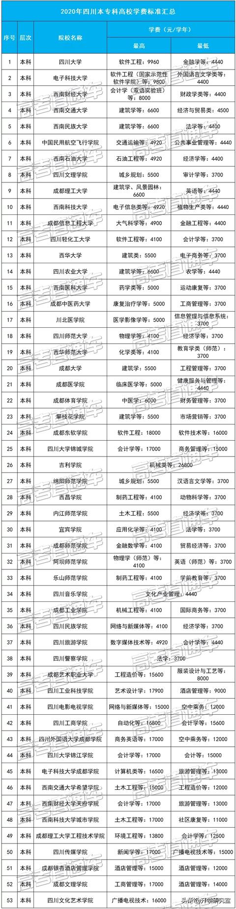 2020年四川本专科高校专业学费标准汇总