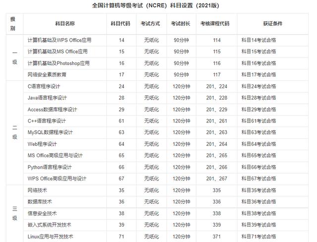 科目:C语言程序设计、C++语言程序设计、Java语言程序设计、Web程序设计、Python语言程序设计、Access数据库程序设计、MySQL数据库程序设计、MS Office高级应用与设计、WPS Office高级应用与设计,共九个科目。 [10] 于九个科目中选择一个参加考试并通过即可。