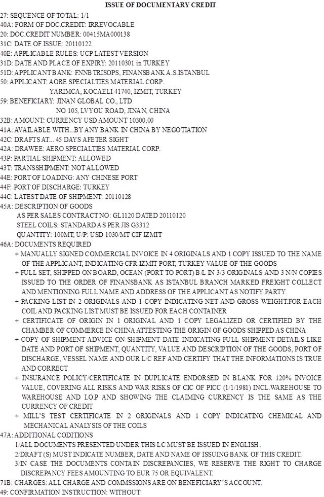 【解析】合同规定使用即期汇票(SIGHT LETTER OF CREDIT),而信用证却规定见票后45天付款(45 DAYS AFTER SIGHT),应修改信用证,否则会造成单证不符。此外,汇票受票人应为开证行(FNNBTRISOPS, FINANSBANK A.S.ISTANBUL)或付款行,而不应该是开证申请人。