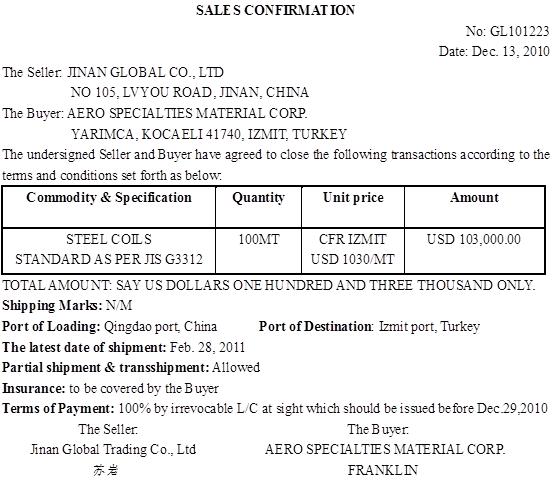 【解析】合同规定卸货港为Izmit港,而信用证却规定卸货港为“TURKEY”,这显然与合同要求不符,必须修改。