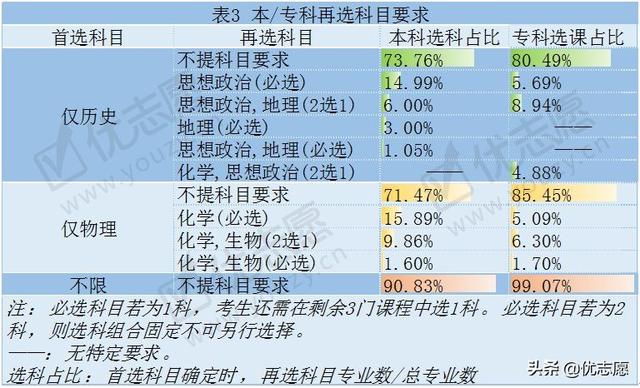 本/专科整体对再选科目降低约束,首选科目为仅历史或仅物理时,超过70%的再选科目没有确定性要求。首选科目不限时,本科对再选科目无要求的专业超过90%,而专科对再选科目无要求的专业达到99%。