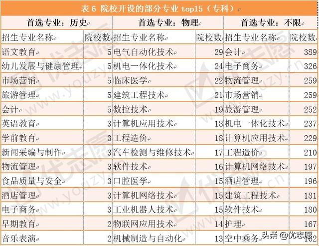 表6为专科院校开设较多的部分专业,要求首选物理和历史的情况和本科大致相同,但首选科目不限时,部分专科院校会开设软件技术、计算机网络技术等专业,即可能有首选科目为历史的学生选择此类专业就读,在没有系统学习过理科知识的情况下,选择此类专业对学生而言也是不小的挑战,也可能有更大的收获。