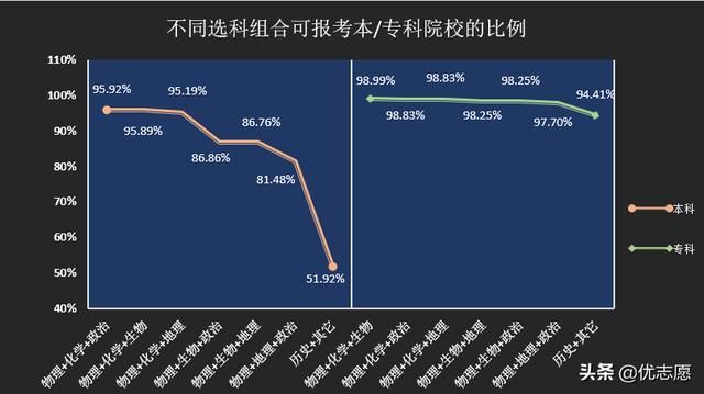 不同选科组合可报考本科院校的差距较大,选择物理、化学和其他可以报考95%以上的本科院校,而首选历史的仅可以报考51%的院校。不同的选科组合对报考专科院校的影响不大,首选物理和历史仅有不到5%的院校差。