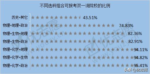 首选科目为物理时,可报考双一流院校占比和整体情况基本一致。但首选历史时可填报双一流院校比例大幅度下降,可选的比例比整体低8%,其选科组合可填报的院校基本在40%左右,双一流院校对文科类考生无较大需求。