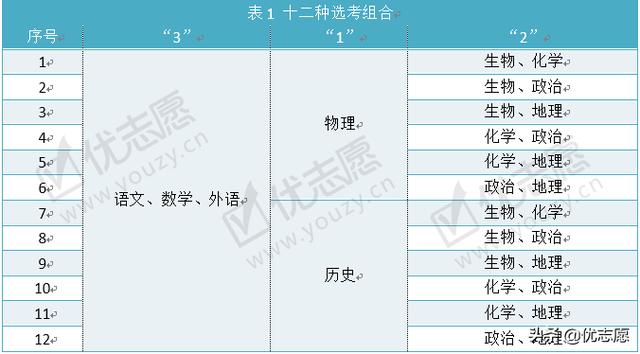 采用“3”+“1”+“2”后,考生可选考科目的范围更广且能对个人不擅长的科目进行有效的规避。表1给出高考改革后考生可以选考的科目组合,共十二种选考模式。
