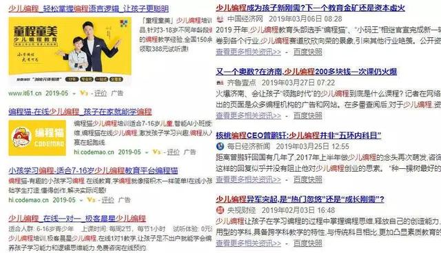 打开百度,搜索少儿编程,映入眼帘的就是各种少儿编程培训班的加盟和报名广告,而在往下翻,则又是一些媒体在质疑少儿编程是否有必要,是否就是圈钱的新套路。由此看来,少儿编程在市场需求和舆论评价方面,都存在极大的话题和争议。