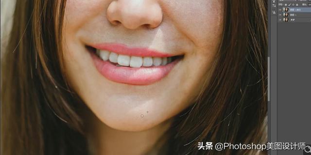 2.【Ctrl+J】复制图层,使用【修复画笔工具】,按【Alt】取样,修复脸部瑕疵部分,具体如图示。