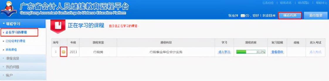 第一步:登陆平台后,点击“正在学习的课程”显示需要完成的年度课题,然后点击