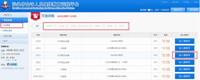 第二步:登陆后,用户在页面上点击“课程选择”—“可选课程”,根据年份选择需要报读的课程,点击“放入购物车”