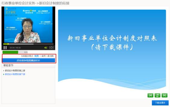 第三步:进入学习页面后会显示本课题的章节及学习的进度,用户可根据需要选择多种格式进行视频播放,如需中途离开可点击“保存视频时长”记录当前时长