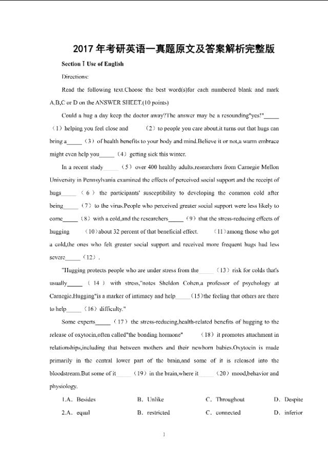 2017考研英语(2017考研英语一真题及答案完整版)